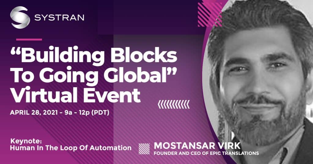 We are excited to take part in an upcoming web conference hosted by our partners at Systran.  The “Building Blocks to Going Global” Conference scheduled for Wednesday April 28, will bring together well-respected companies with worldwide reach, like GoDaddy, LivePerson, YEXT, Eddy Pump, and EPIC Translations.