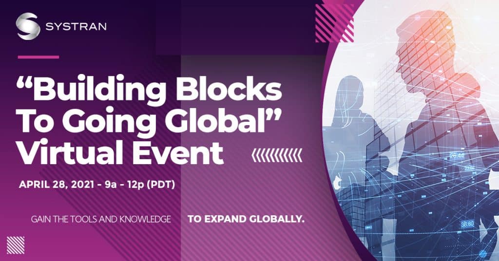 But to do that you need a solid plan based on an up-to-date understanding of technology and other global elements and how they can affect trade, internationally and in your target market(s). Attending the “Building Blocks to Going Global” conference is one way to make sure you are up-to-speed.  Registration is free, and you can sign up at https://www.systran.us/going-global/.